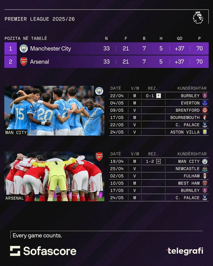 Arsenali, nga ana tjetër, në letër ka një orar pak më të lehtë, me kundërshtarë që nuk janë drejtpërdrejt në garë për Evropën apo që janë në fund të tabelës. Mes tyre përmenden Newcastle, Fulham dhe Crystal Palace, ndërsa Burnley tashmë ka rënë nga kategoria. West Ham, që po lufton për mbijetesë, shihet si një nga pengesat më të rrezikshme.